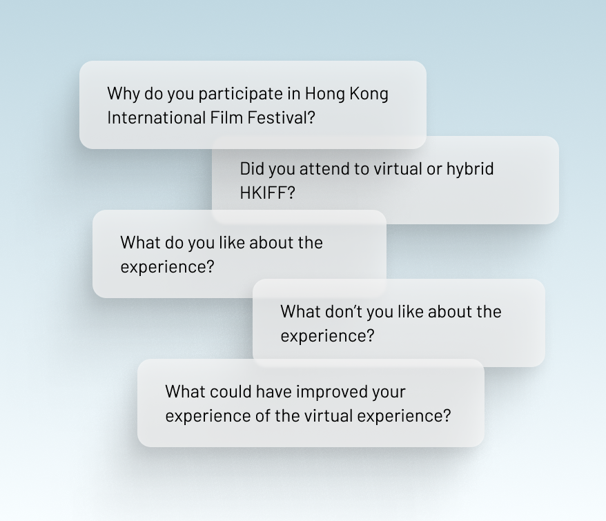 To learn about user experiences with HKIFF and HKIFF online, I conducted user interviews. I interviewed 5 people between the ages of 24-40, 10-15 minutes each, asking open-ended questions to learn about their experiences.